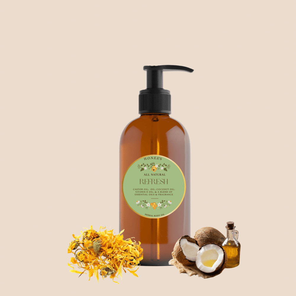 Rejuvenate your skin with Refresh, a deeply hydrating body oil crafted to restore and soften. Featuring nourishing castor oil and soothing calendula petals, it calms dryness and promotes a healthy, radiant glow. Enriched with vitamin E oil, this blend helps protect and revitalize your skin with every use. The warm, comforting scent of honey vanilla lingers gently, creating a cozy, refreshing experience. Perfect for daily hydration or a moment of self-care bliss.